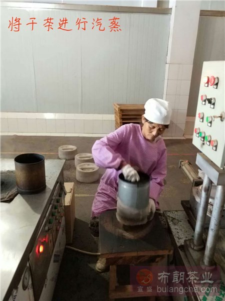 圖二是將稱量好的毛茶進(jìn)行汽蒸,通過(guò)高溫使干茶變軟,蒸茶,把茶蒸軟,茶膠溶出,茶才能壓緊。